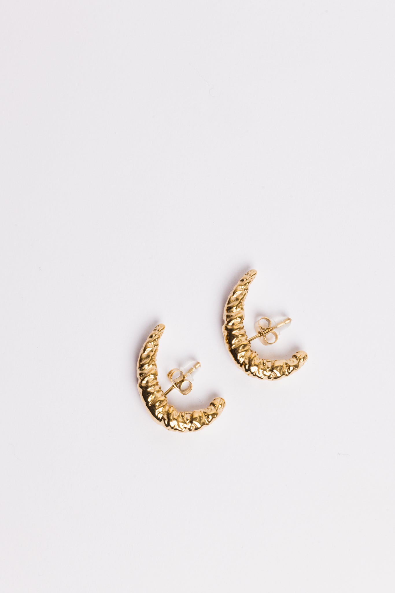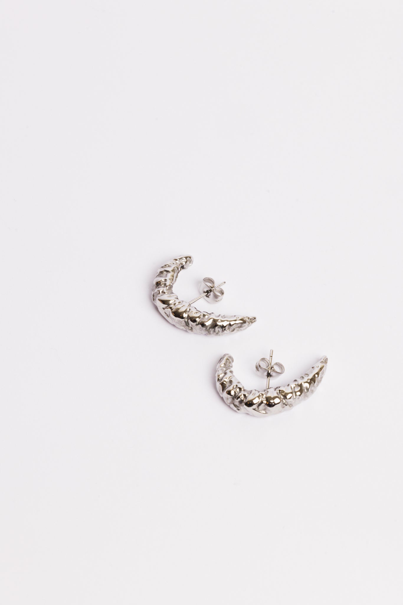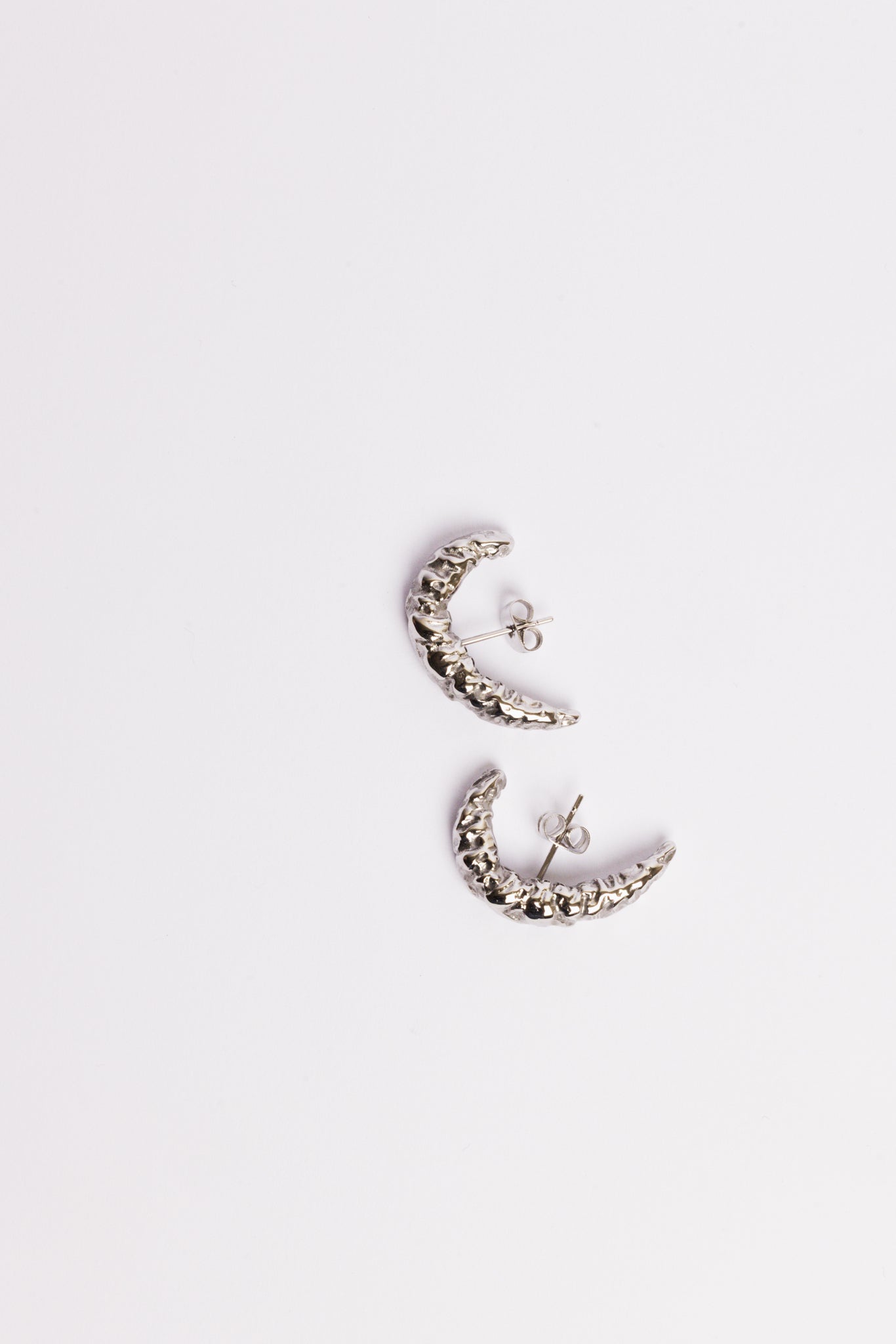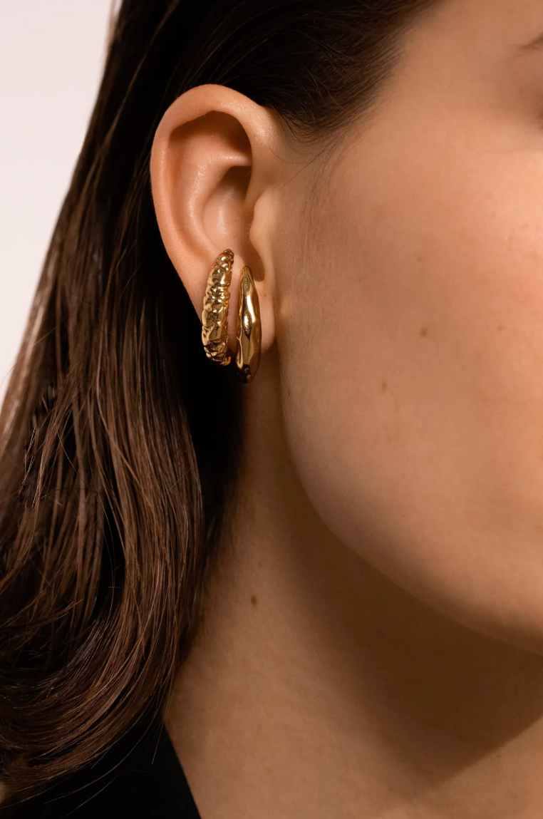 De Moon Hoops vormen een subtiele, maar uitgesproken ear-cuff look — zonder dat je extra piercings nodig hebt. De organische halve maanvorm heeft een verfijnde, getextureerde afwerking die doet denken aan maansteen en gesmolten metaal.