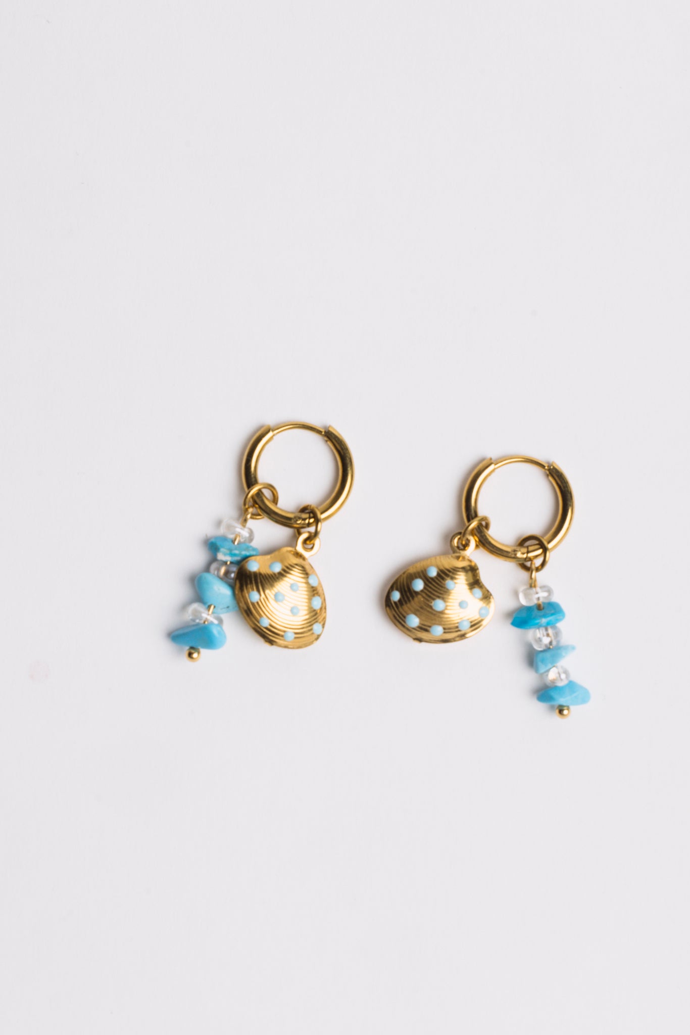 Gouden oorbellen met schelpdetail en turquoise accenten die meteen doen denken aan zon op zee. Speels, verfijnd en gemaakt om op te vallen zonder moeite