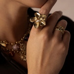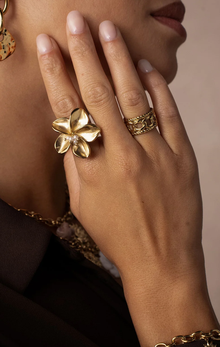 De Bloom Pearl Ring is een vrouwelijke en sculpturale eyecatcher. De sierlijke, driedimensionale bloem straalt elegantie uit en wordt verfijnd door subtiele witte resinparels in het hart van het ontwerp. De glanzende afwerking geeft de ring een luxe en speelse uitstraling — perfect voor wie houdt van expressieve sieraden met een zachte touch.