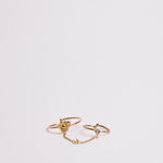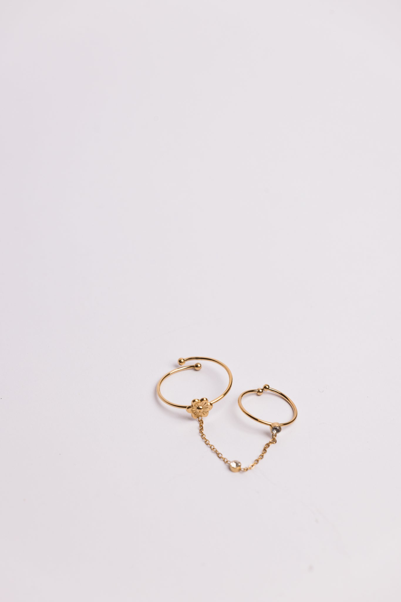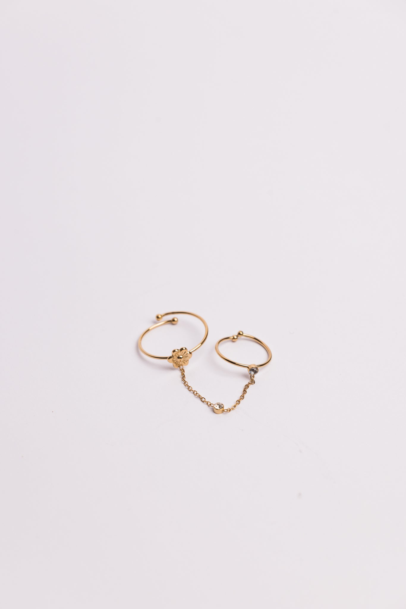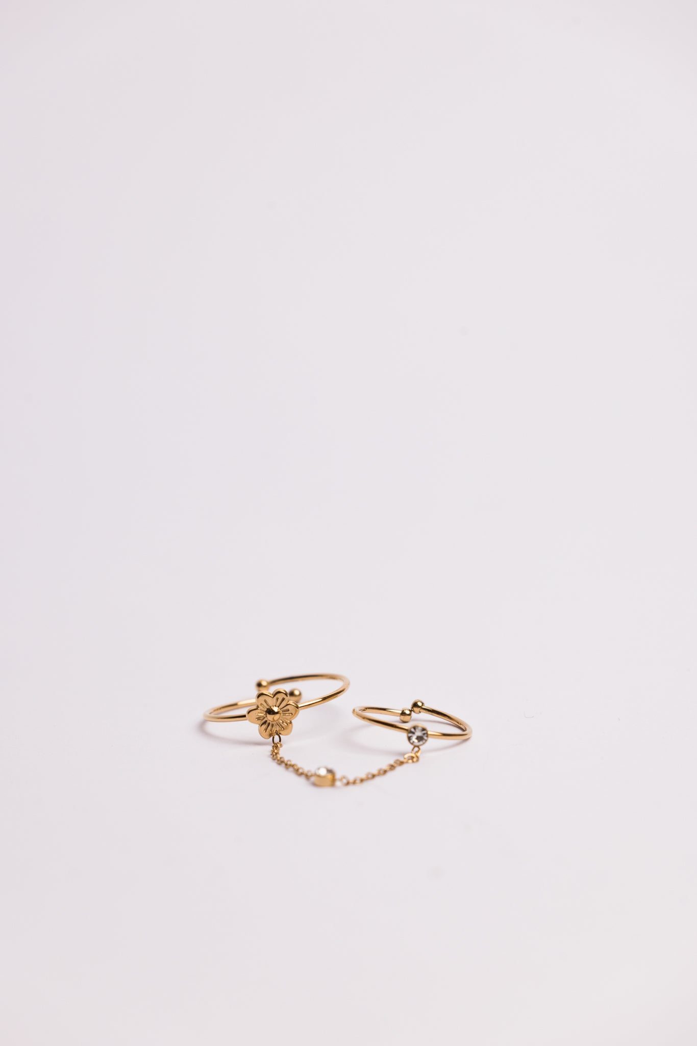 De Linked Bloom Chain Ring is ontworpen voor wie durft te spelen met vormen en elegantie. Deze dubbele ring wordt verbonden door een fijne, bewegende chain — subtiel maar expressief. Eén ring is versierd met een kleine bloem, de andere met een delicate zirconia steen, waardoor het ontwerp balans vindt tussen zachte romantiek en moderne minimaliteit.