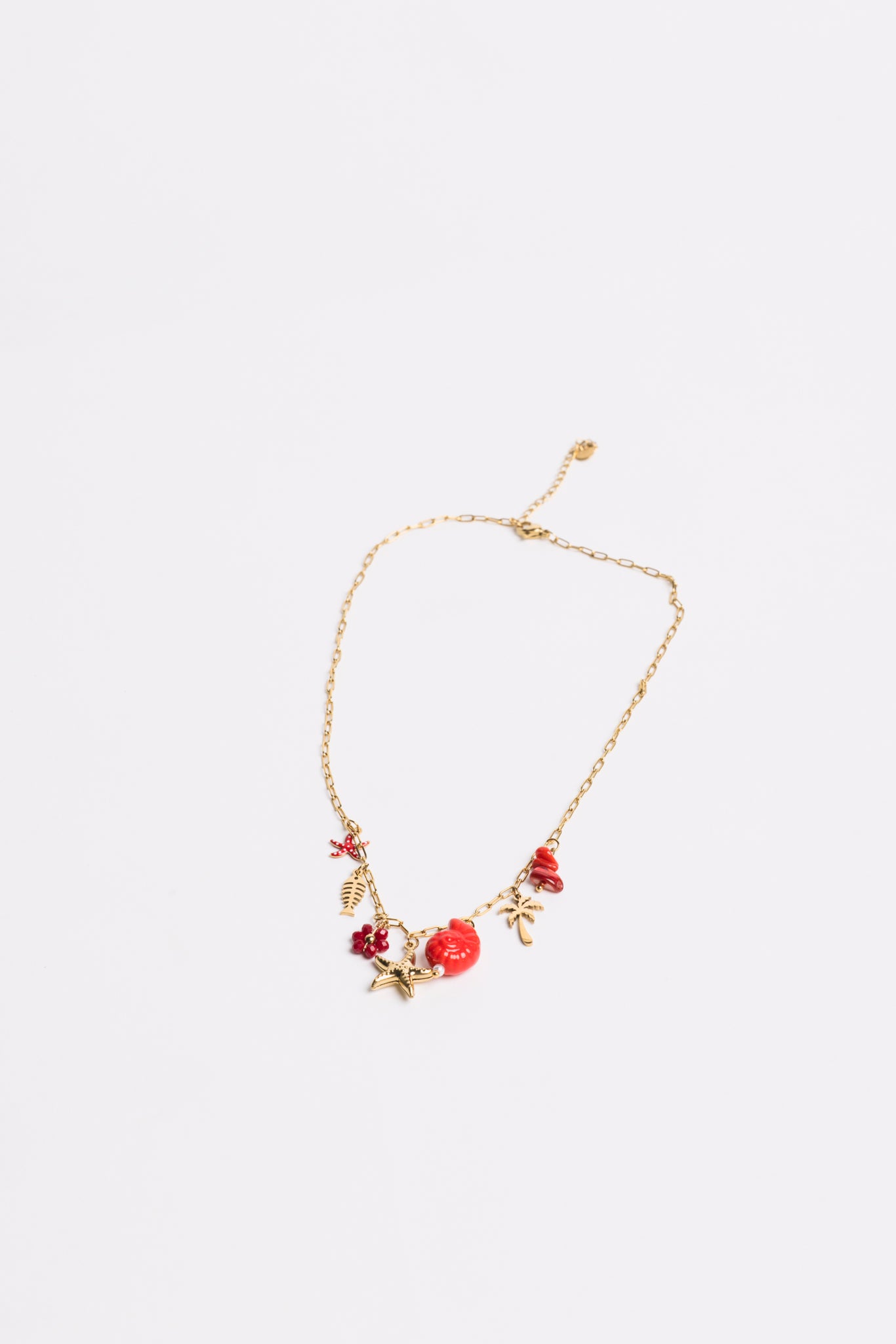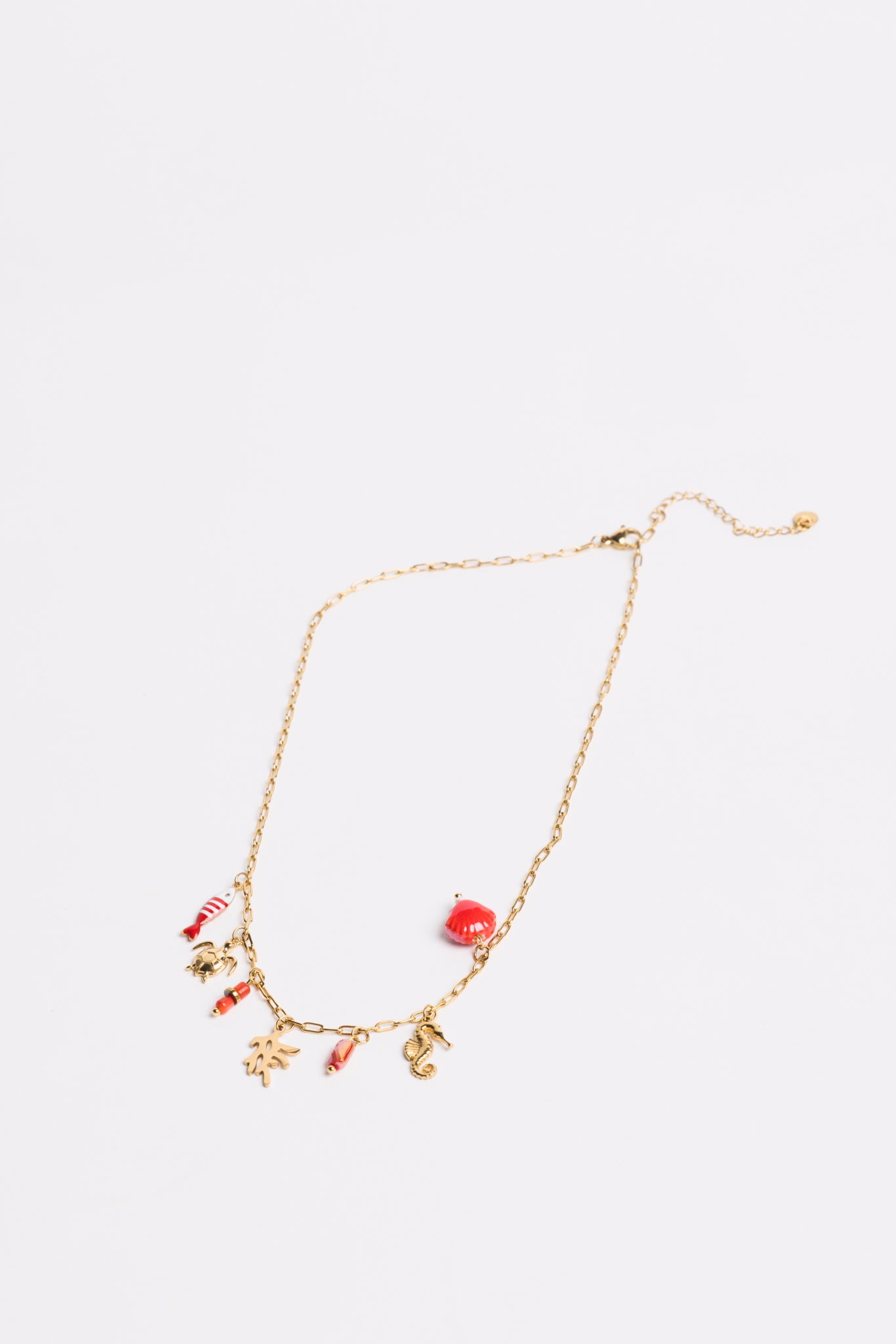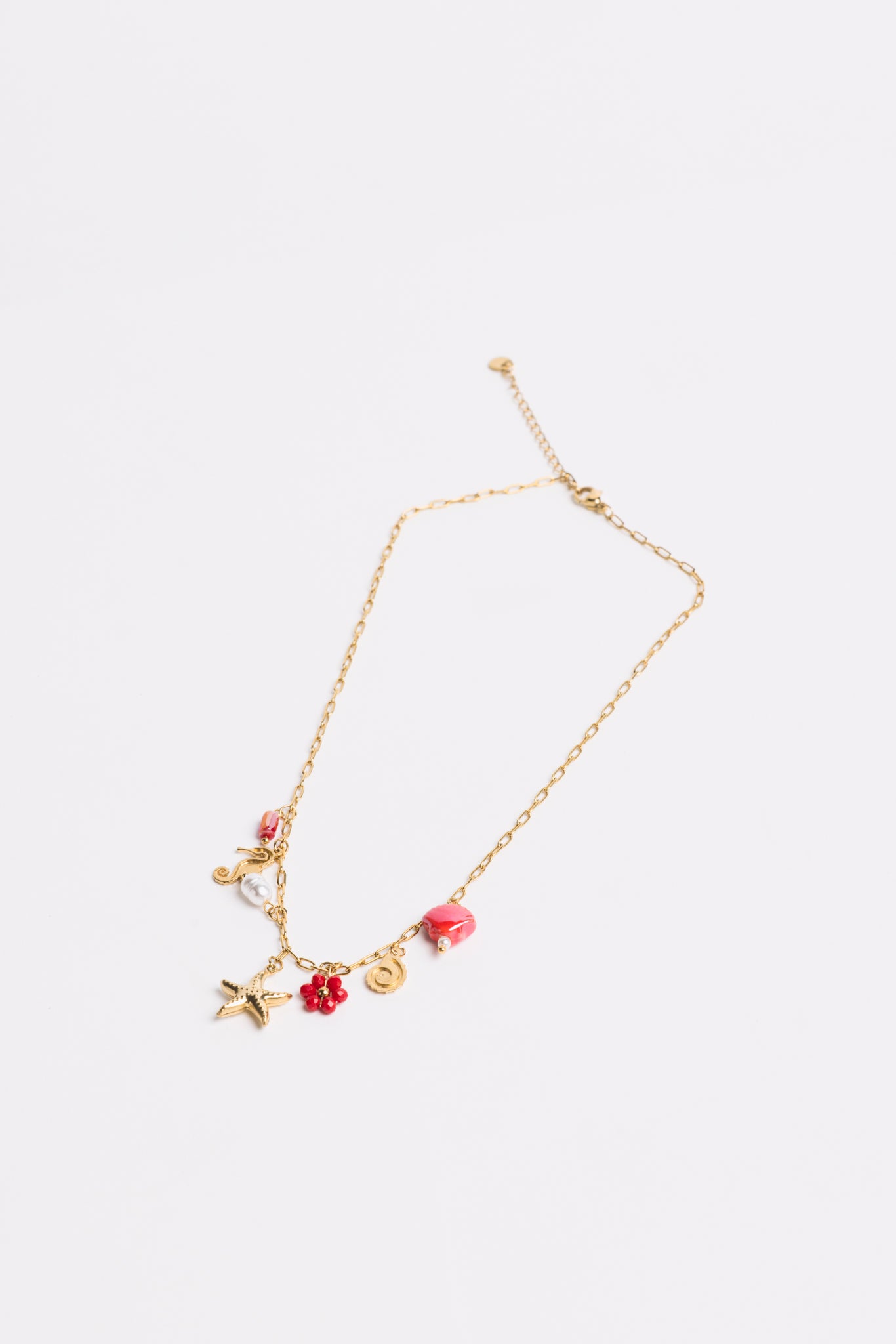 Geef je look een speelse touch met de Coral Reef Charm Necklace. Deze rode charm ketting heeft een unieke uitstraling met zomerse bedeltjes zoals schelpjes, zeesterren, koraal en andere ocean-inspired details. Perfect om te combineren en te layeren met andere kettingen en de bijhorende armbandjes. Dankzij de verstelbare sluiting draag je hem altijd op jouw ideale lengte. Verkrijgbaar in verschillende varianten binnen één stijlvolle collectie.