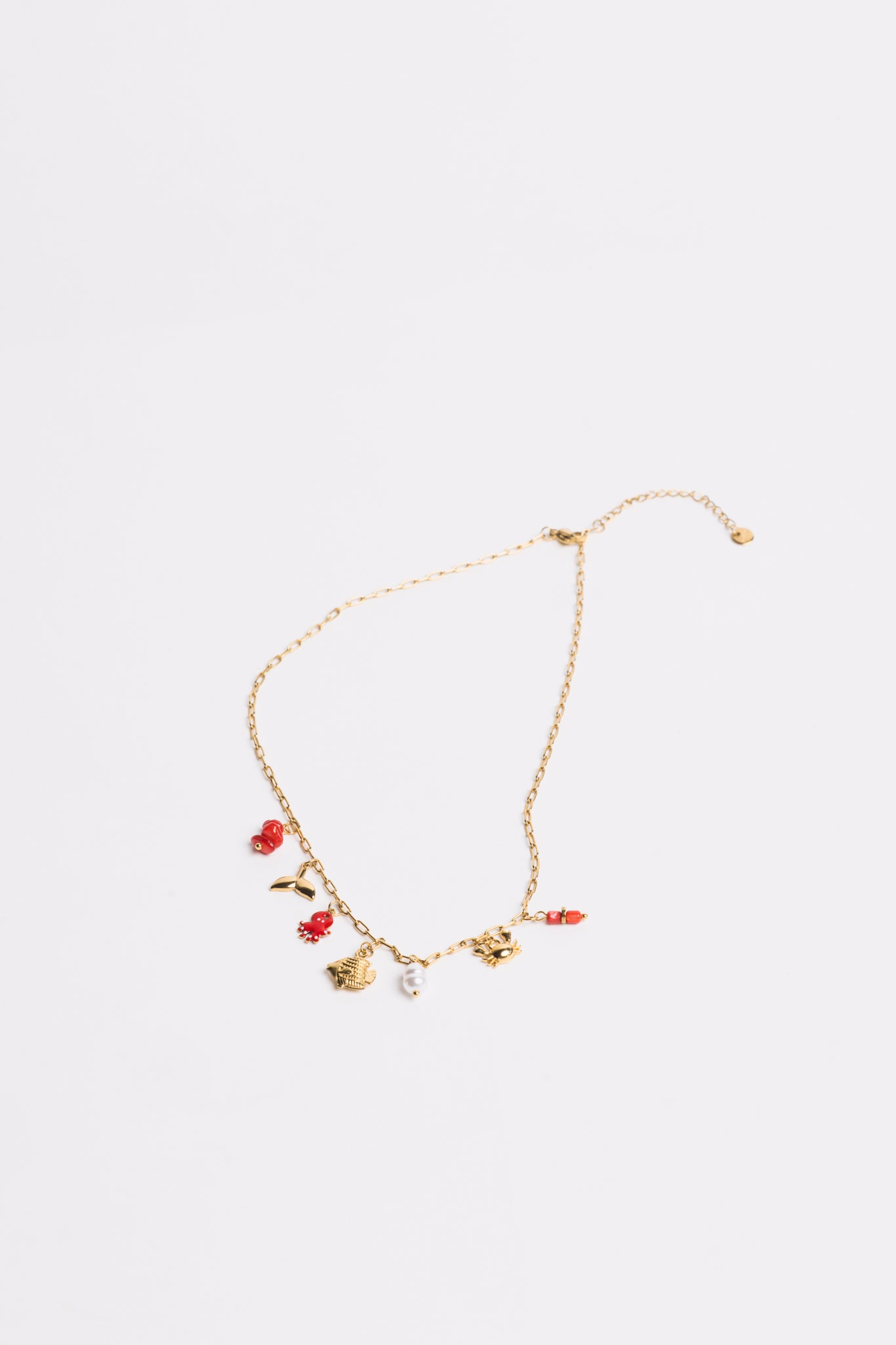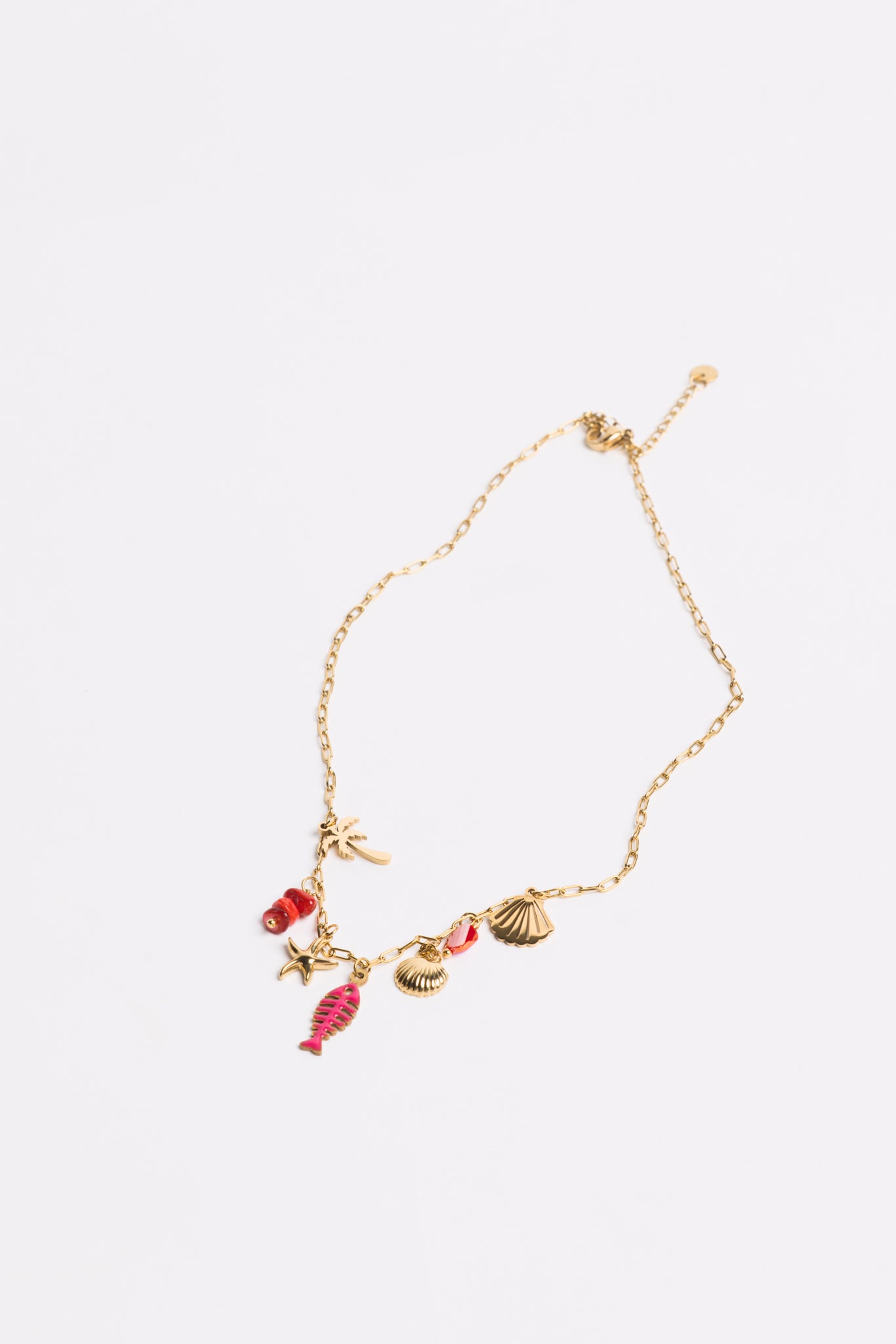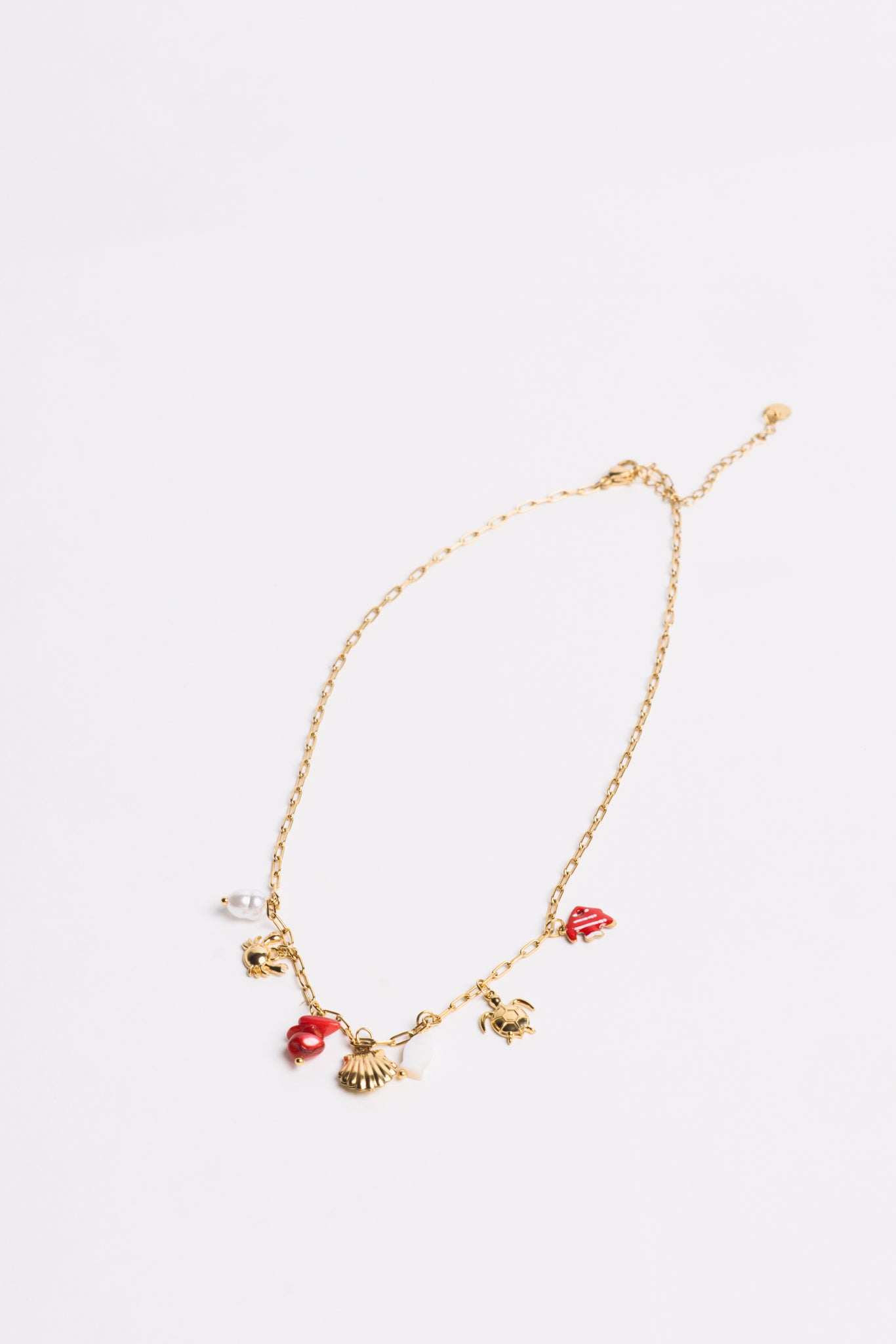Geef je look een speelse touch met de Coral Reef Charm Necklace. Deze rode charm ketting heeft een unieke uitstraling met zomerse bedeltjes zoals schelpjes, zeesterren, koraal en andere ocean-inspired details. Perfect om te combineren en te layeren met andere kettingen en de bijhorende armbandjes. Dankzij de verstelbare sluiting draag je hem altijd op jouw ideale lengte. Verkrijgbaar in verschillende varianten binnen één stijlvolle collectie.