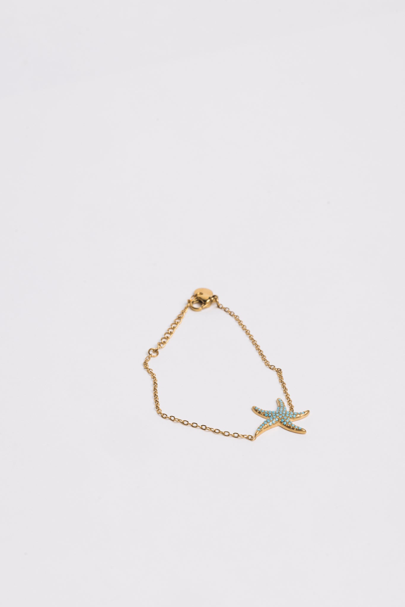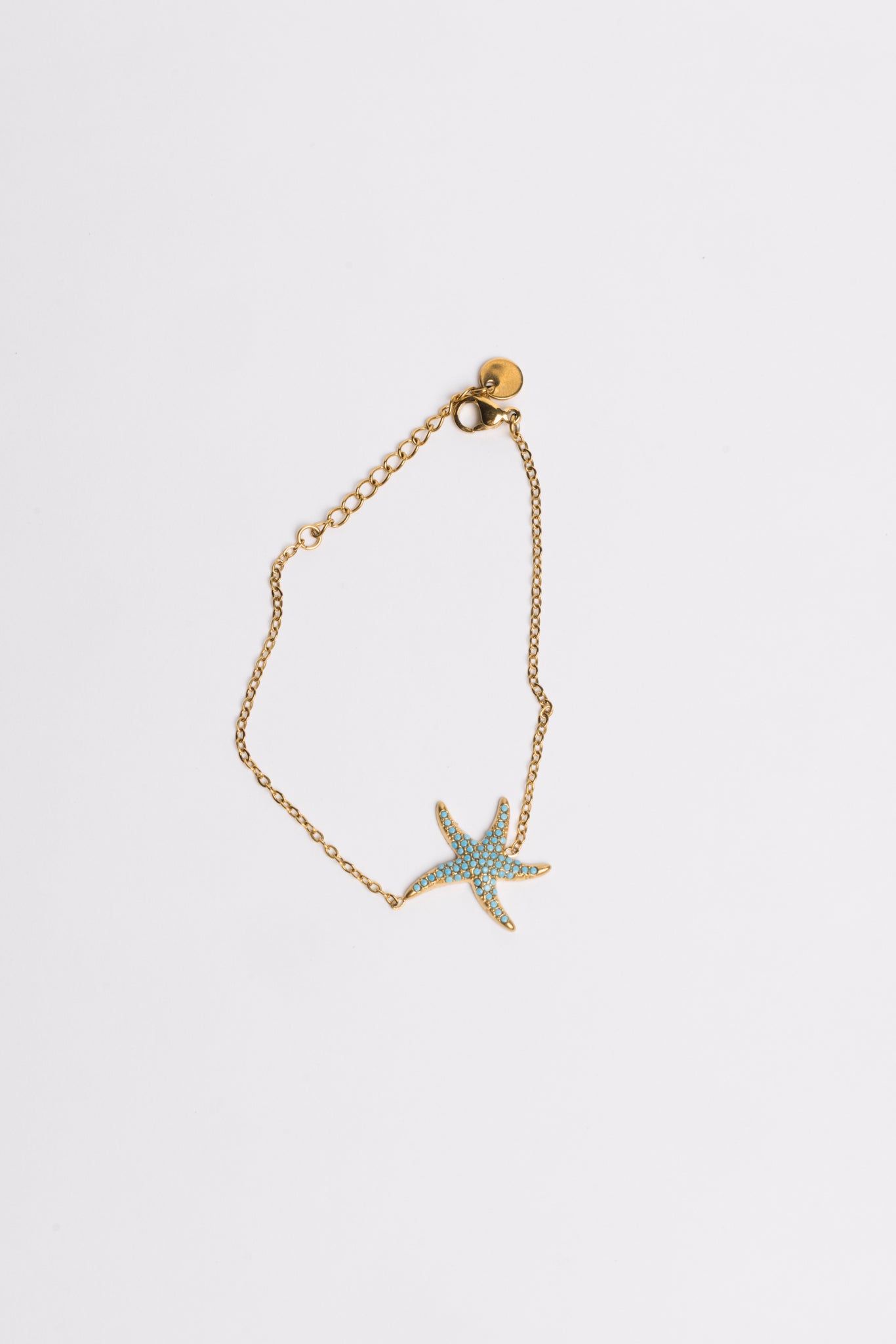 Een gouden armband met zeesterdetail en turquoise accenten voor een subtiele touch van ocean magic. Fijn, elegant en de perfecte finishing touch voor elke look.