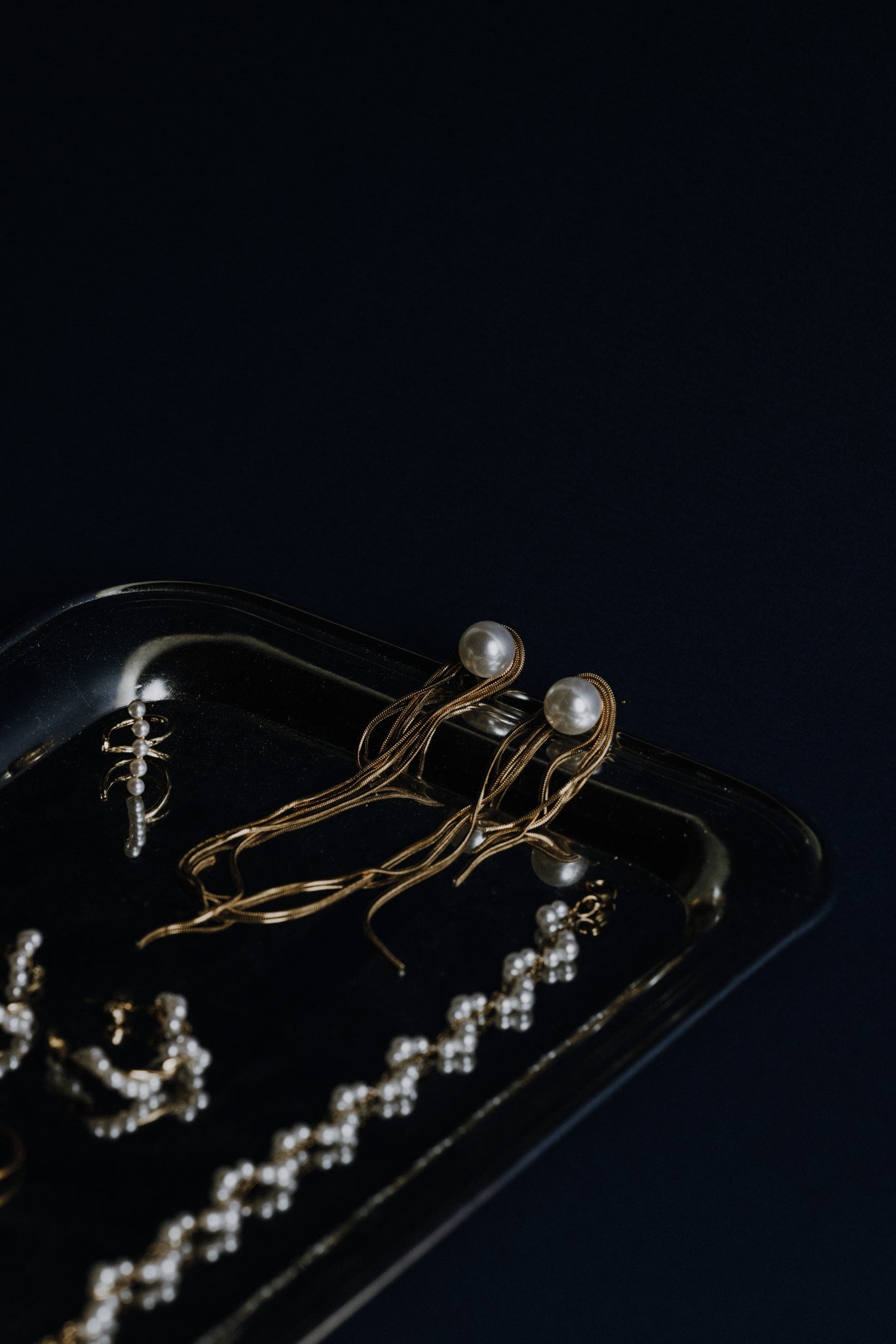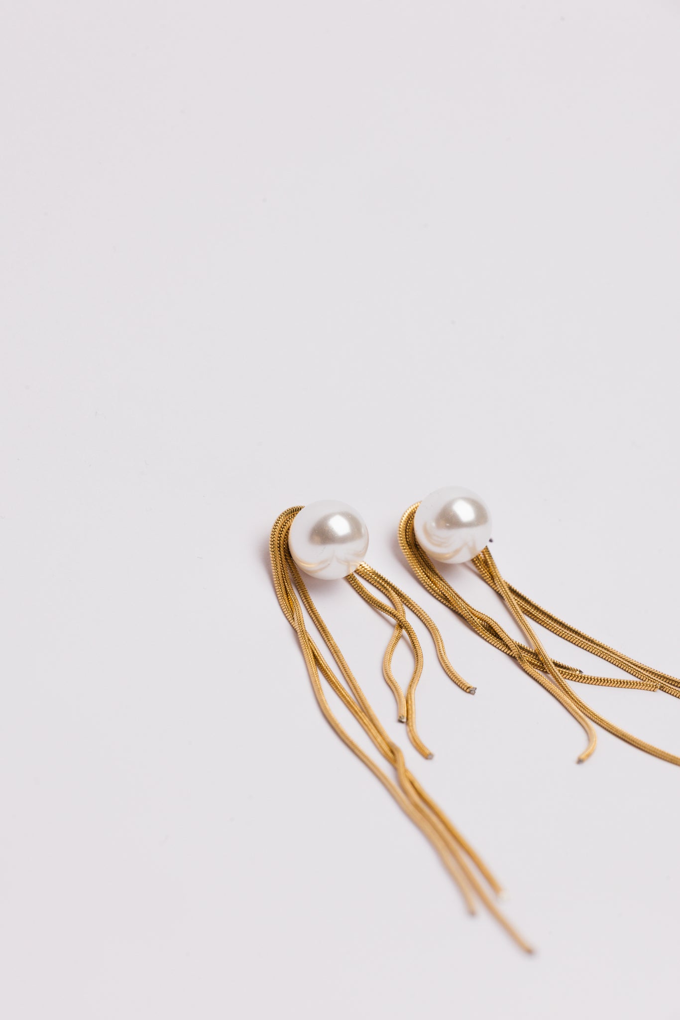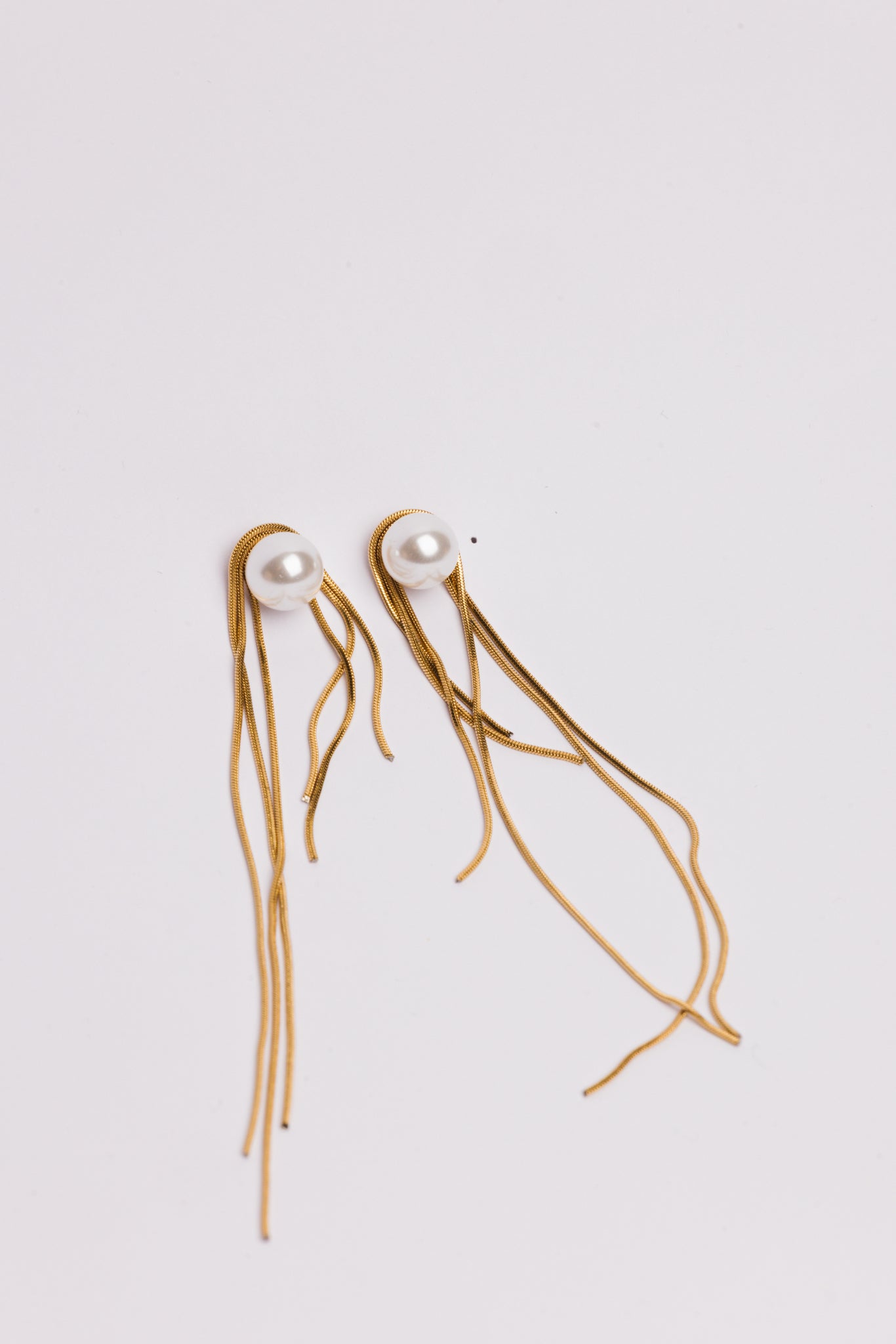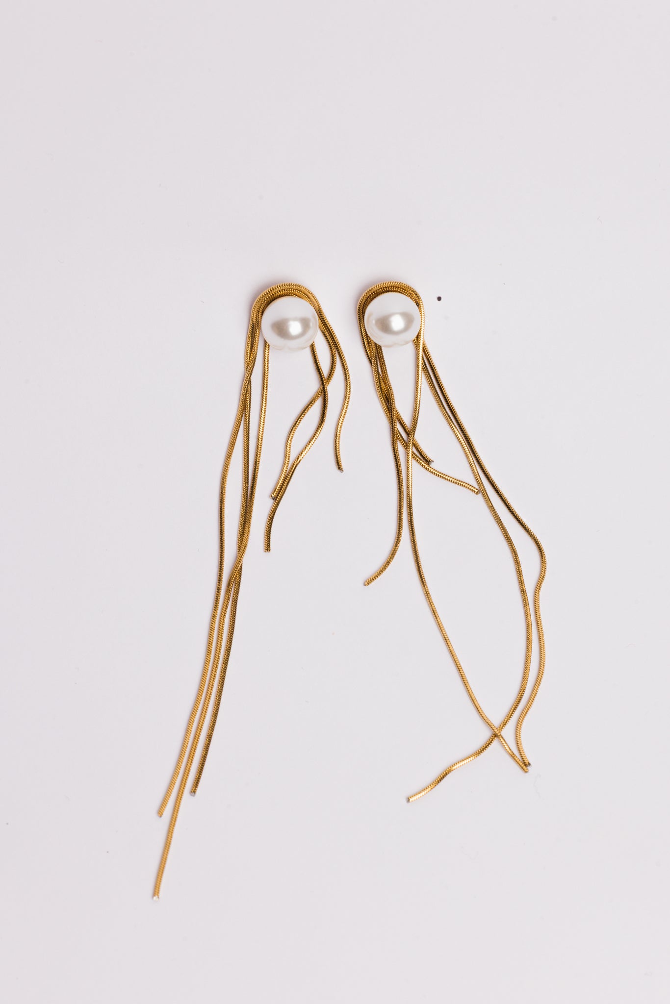 De Pearl Waterfall Earrings brengen zachte elegantie samen met een vloeiende, moderne vorm. Bovenaan schittert een klassieke parel, terwijl fijne goudkleurige chain details er speels langs naar beneden vallen. De beweging van de kettinkjes creëert bij elke stap een subtiele, luxueuze glans.
