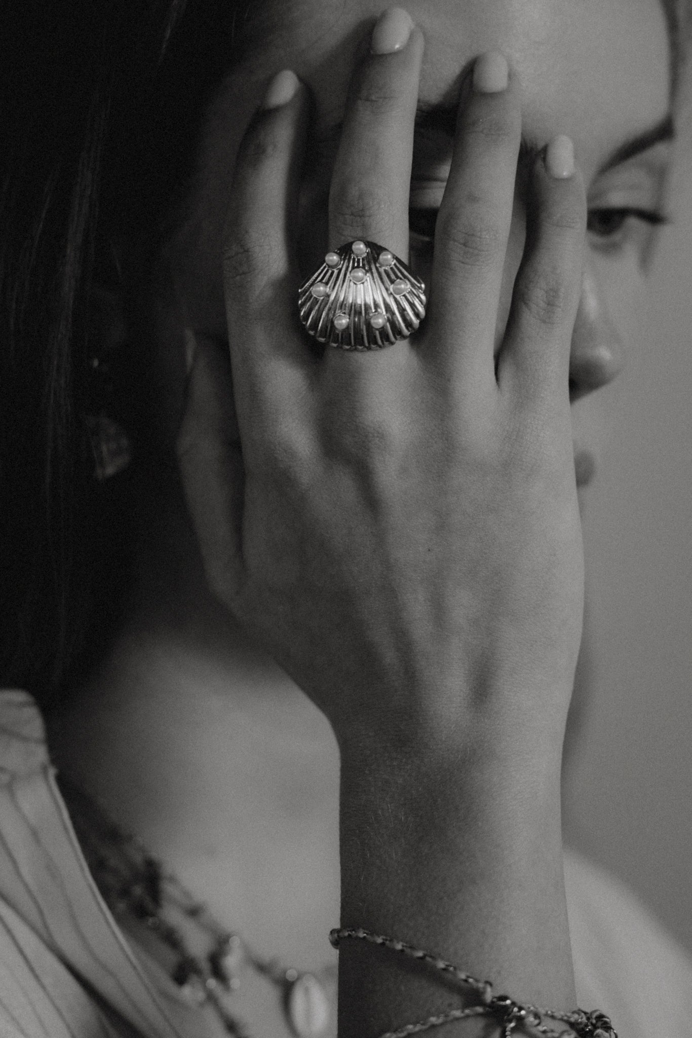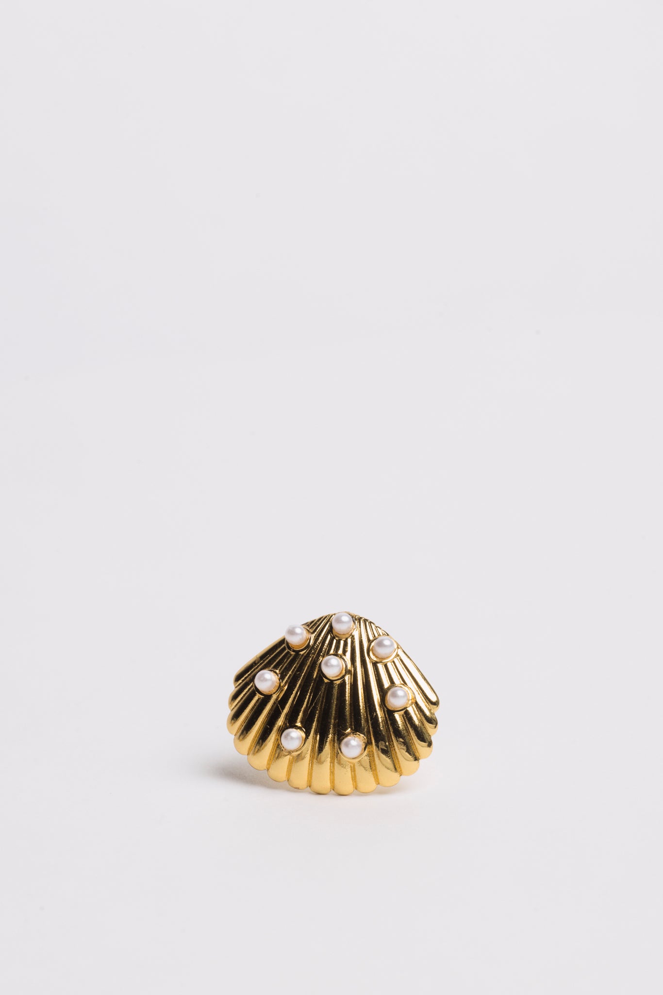 Een statement ring geïnspireerd op de schoonheid van de oceaan. De gouden schelpvorm met fijne pareldetails zorgt voor een luxe en elegante uitstraling. Perfect om solo te dragen of te combineren met je favoriete sieraden. Verstelbaar in maat voor de perfecte fit.